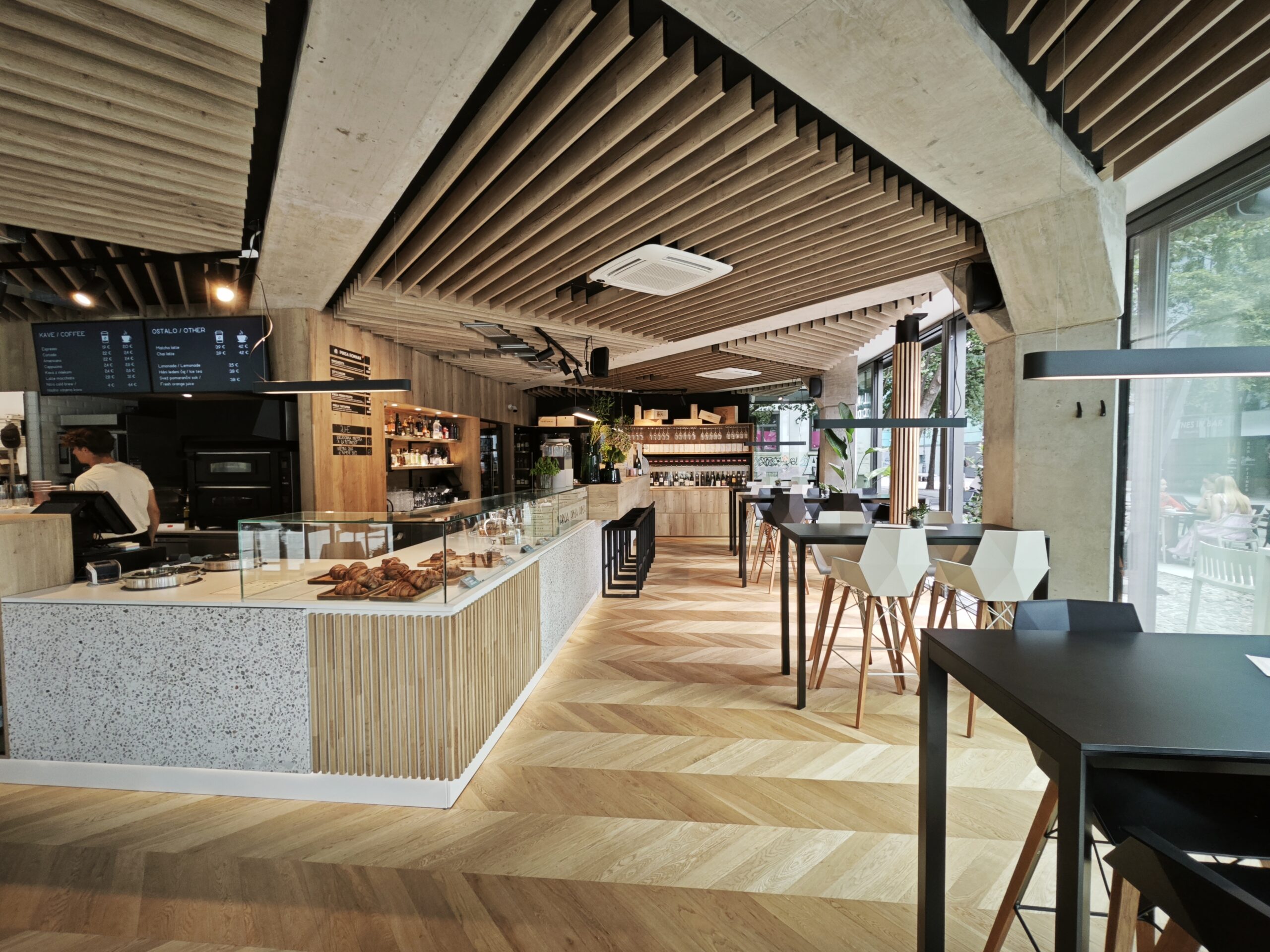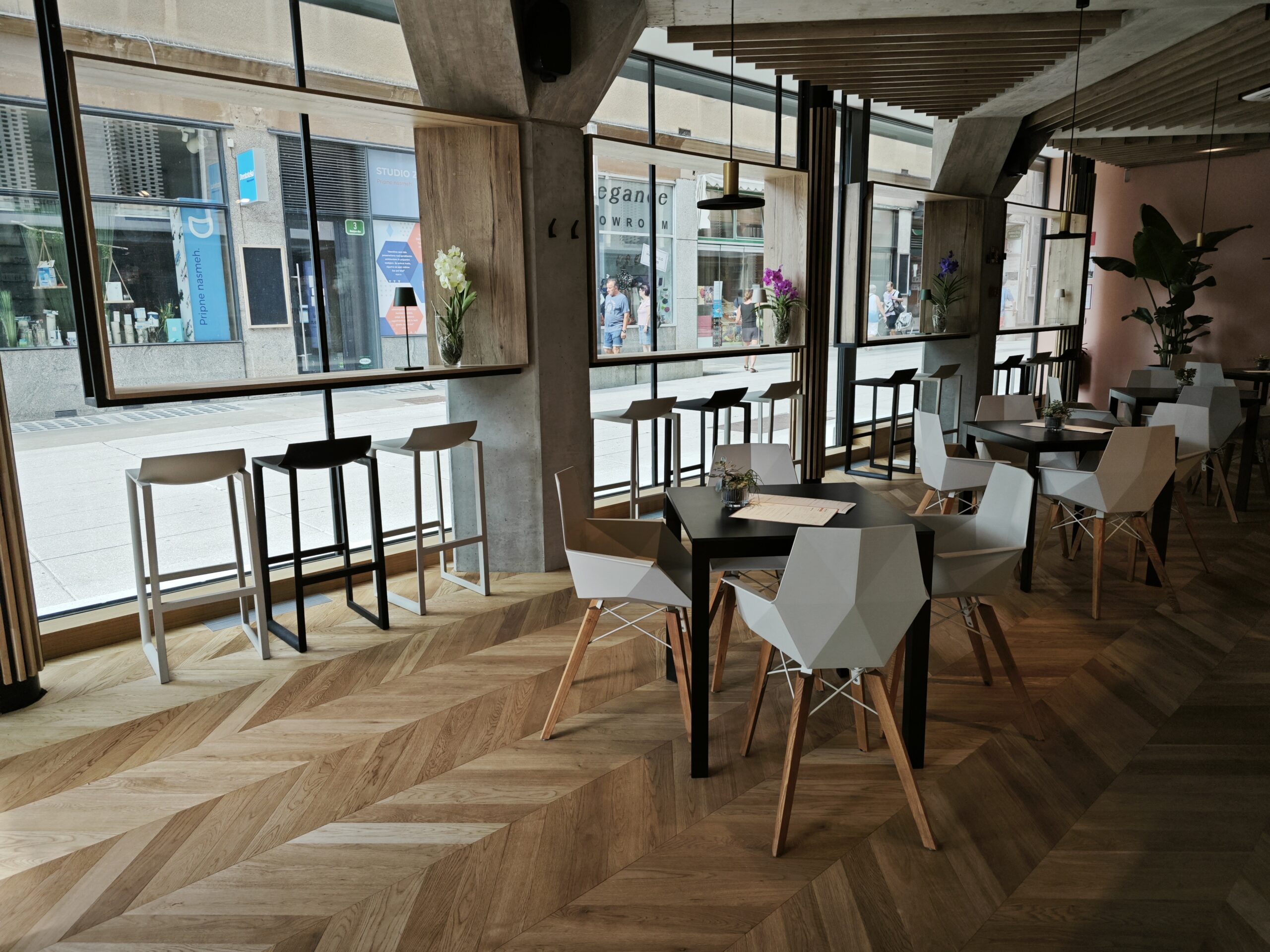 In the pleasant ambiance of the Ljubljana café Lana’s Corner, we ensured a natural and aesthetically refined floor covering by installing our premium oiled parquet. The parquet in the Chavron pattern perfectly accentuates the refined elegance and modern character of the café.